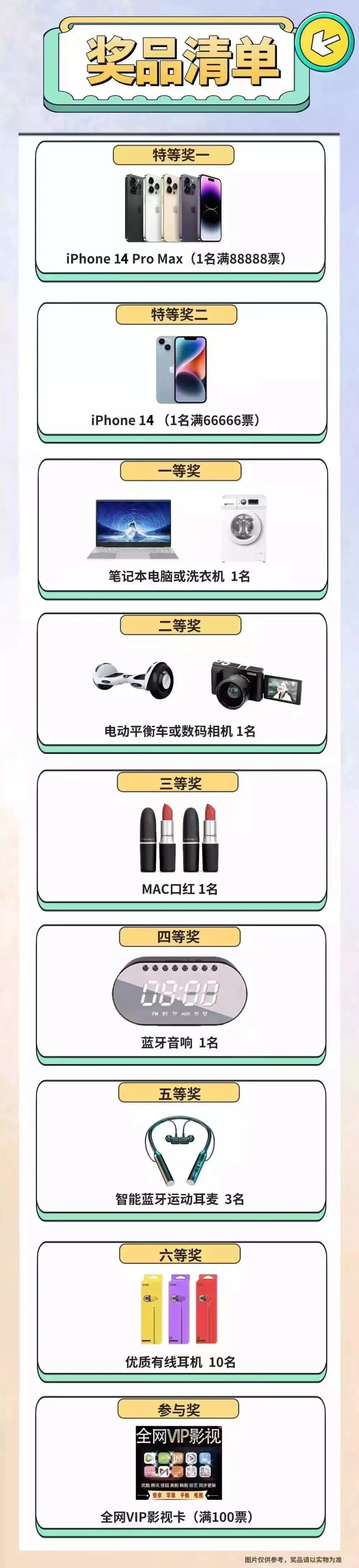 3.注意:每个奖项有且只设置一个,达到票数要求即可获得获奖资格,票数高者优先得奖品,票数低者自动降到下一奖项,所有奖项都根据选手的票数高低依次类推;