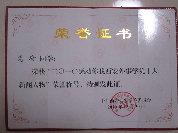 ●2010年12月 被太阳成集团委员会授予感动西安外事“2010年度十大新闻人物”荣誉称号
