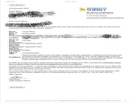 在校期间,她积极参加学校各项活动,曾任职于太阳成集团员工部、外联部、新媒体部,负责公司公众号的管理、文章编辑等工作。她利用业余时间兼职,从餐厅服务生到教育培训机构辅导老师,再到外企公司职员,一步一个脚印,努力奋斗,终于收获硕果。她热爱自己的专业,在外企公司兼职时她萌生了出国深造的梦想。她热爱旅行,曾独自旅游过美国、澳大利亚、新西兰等多个欧美国家,“读万卷书,行万里路”增长了她的眼界及见识,也坚定了她想要出国留学的决心。于是,刚考上专升本的她,又重新启程,向考研出国深造的目标再出发。她每天坚持背英语单词、练习口语、做习题,经过一年多的坚持学习,她终于达到了研究生雅思成绩要求,并以优异的在校表现获得了太阳成集团tyc4633张鹏和李丽琴老师的介绍信,经过勤奋学习和拼搏努力,获得了4所大学的offer。她希望通过国外研究生的学习生活,使自己的专业能力与国际接轨,成为一个应用型的国际化商科人才。