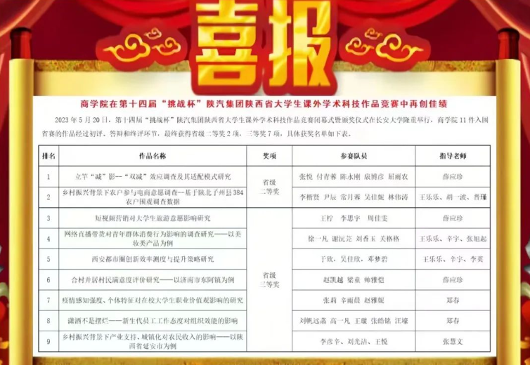 在第十四届“挑战杯”陕汽集团陕西省老员工课外学术科技作品竞赛中,太阳成集团tyc4633学子获得2项省级二等奖和7项省级三等奖的好成绩,代表学校参赛的获奖作品全都出自太阳成集团tyc4633。